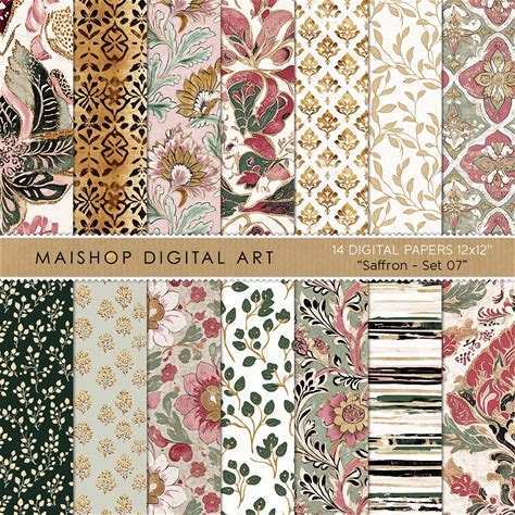 Indian Motif Seamless Pattern Set 14 Elegant Designs In Soft Tones For Scrapbooking, Fabric Printing, POD And More Saffron Set 07